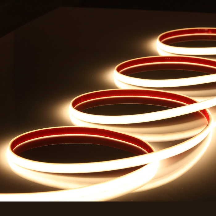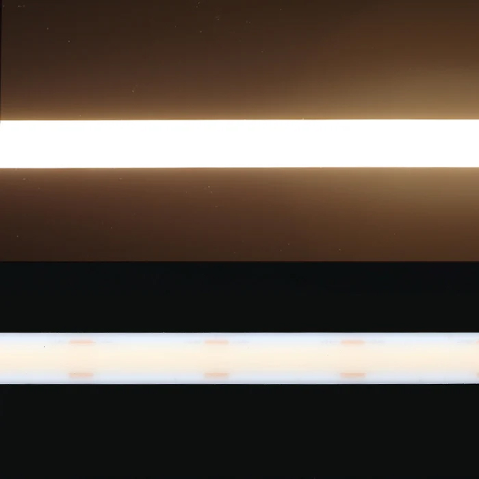 This IP65 warm white LED strip has a 3000K color temperature and runs on 24V DC. It uses 15 watts per meter and delivers up to 1610 lumens, with an efficiency of around 120 lm/W. With a CRI over 90, it provides soft, continuous light with no visible dark spots. The COB design ensures a smooth and uniform glow without the dotted appearance of traditional LED strips. A silicone diffusion layer improves light consistency and increases the illuminated surface area.